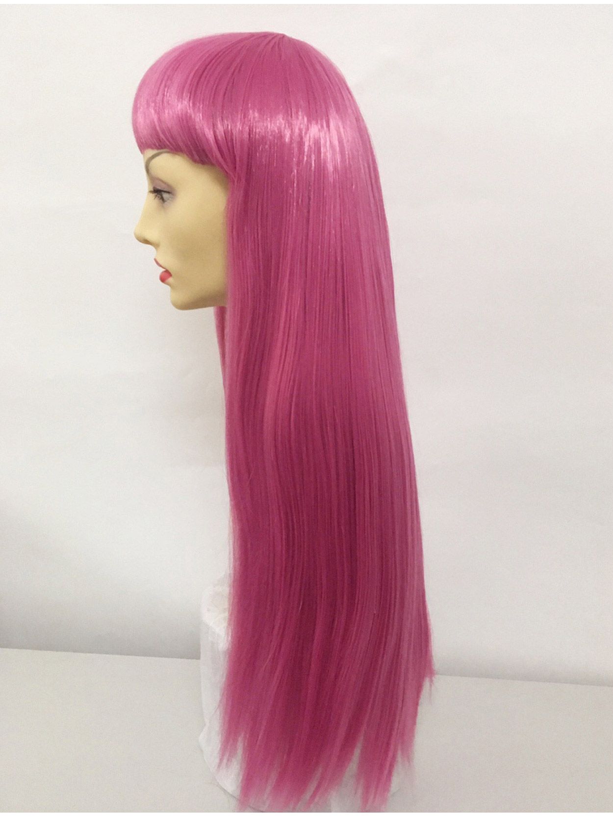 The lustrous pink hair lengths fall sleek and straight, and the short fringe with wide, blunt cut adds the edgy, high fashion touch.