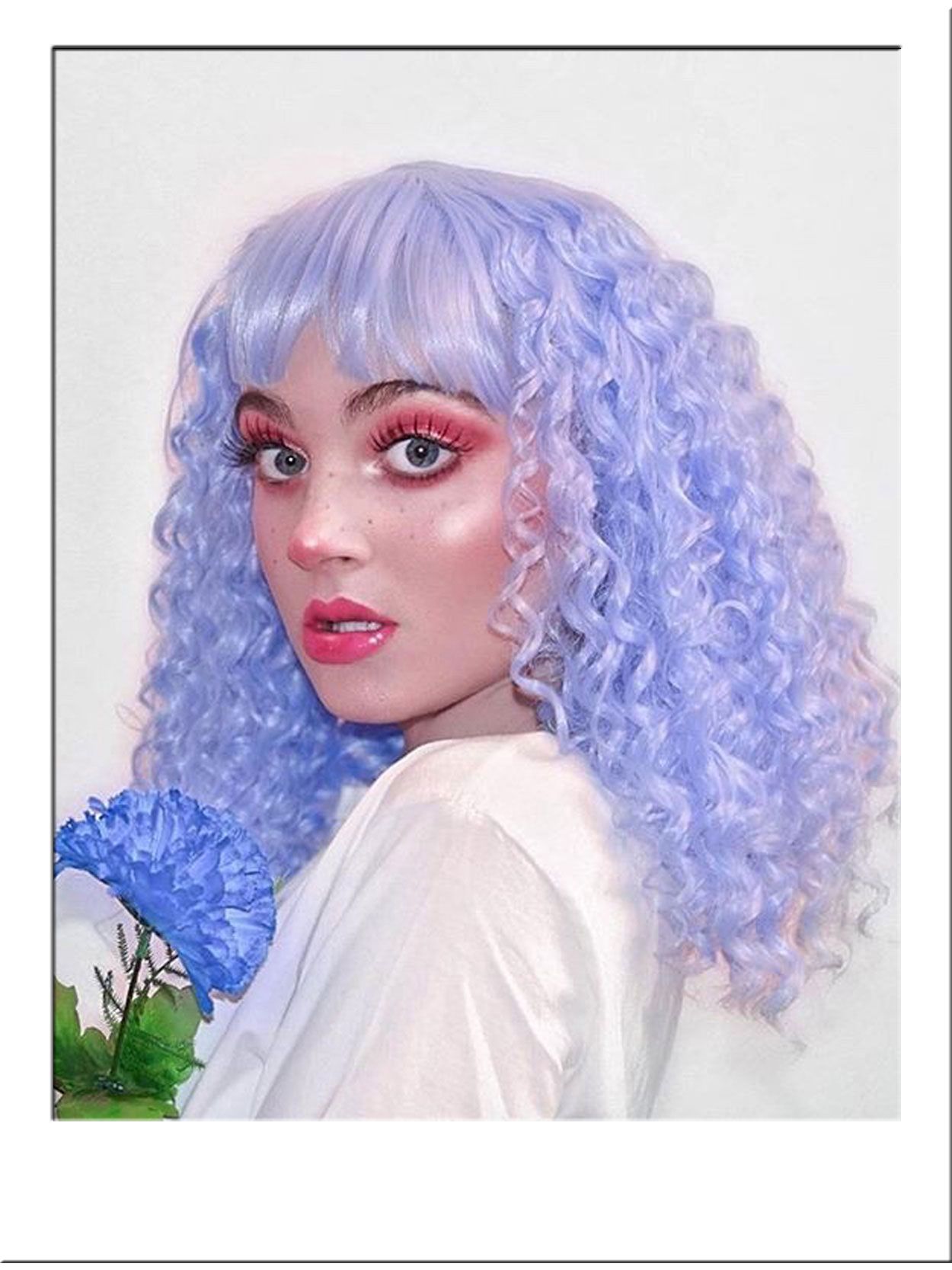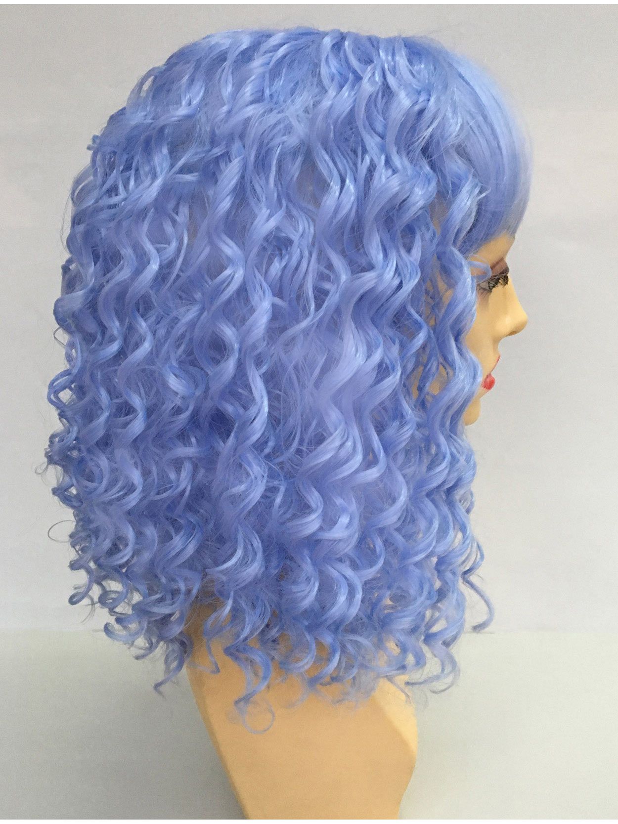 A brave and beautiful wig featuring tight curly hair lengths in a pretty shade of pastel baby blue.