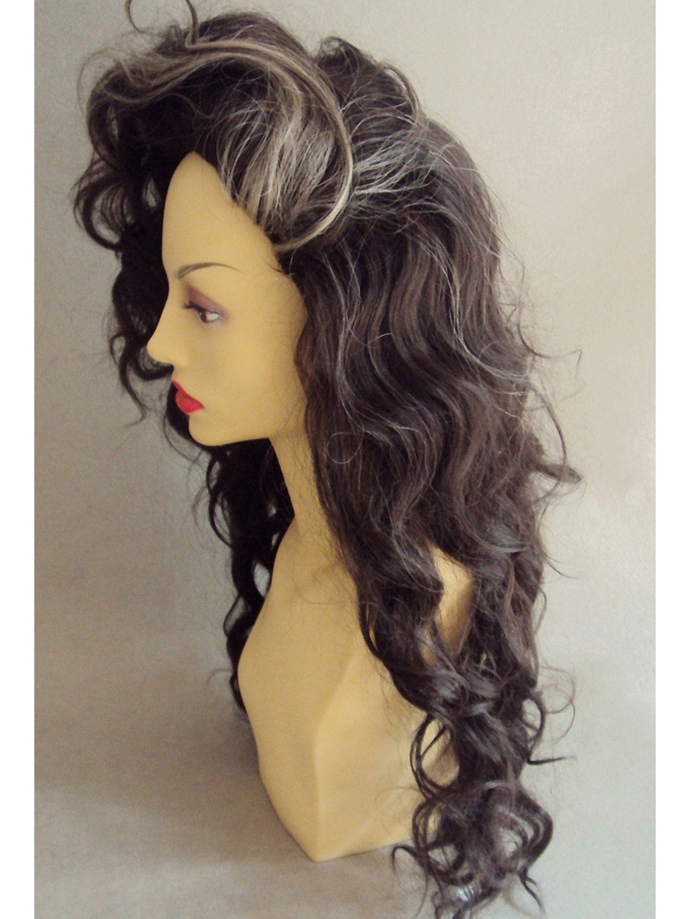 Featuring a full, thick mass of curly layers measuring 21 inches long, and dramatic, lifted, voluminous roots with distinctive swept grey streak.