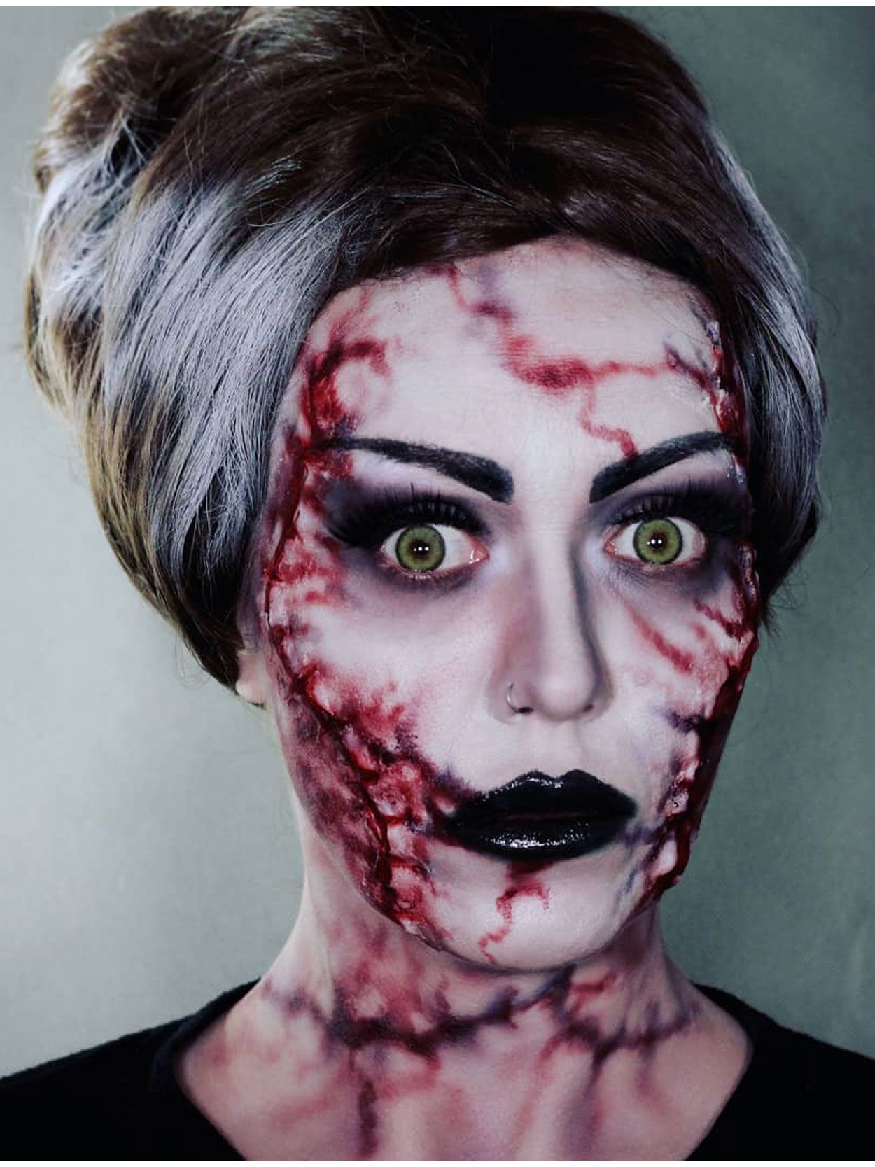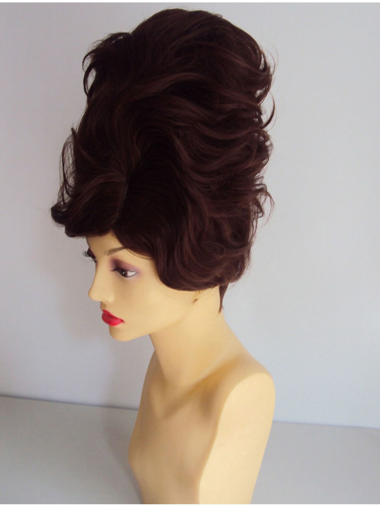 Our horrifying, Halloween inspired costume wig features a carefully constructed large beehive cut with mini side parting and natural layers.