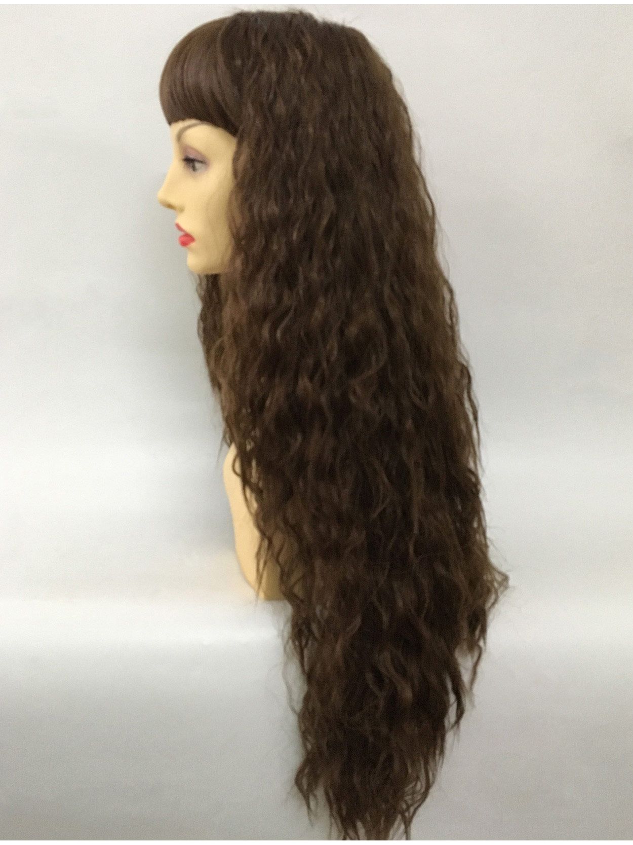 The heavy bangs sit straight and full and can be trimmed or styled to suit.