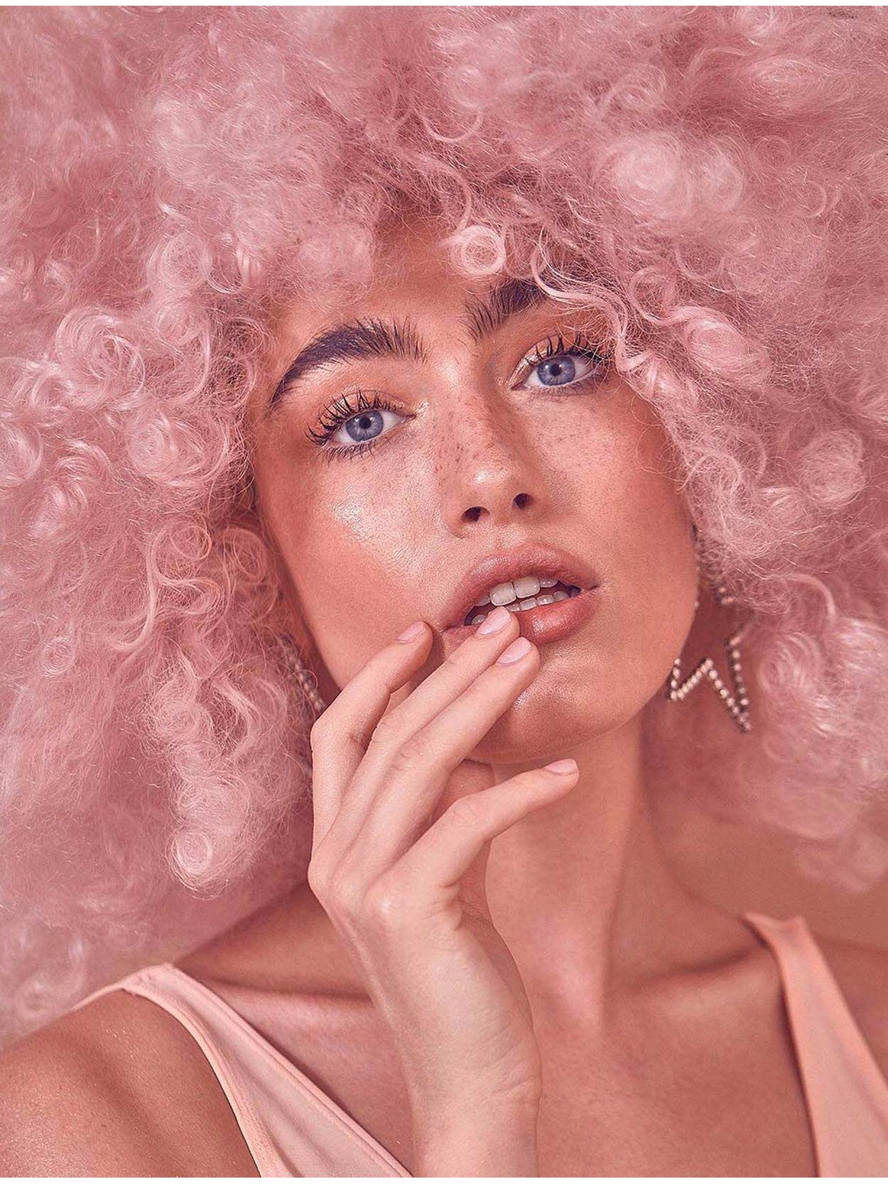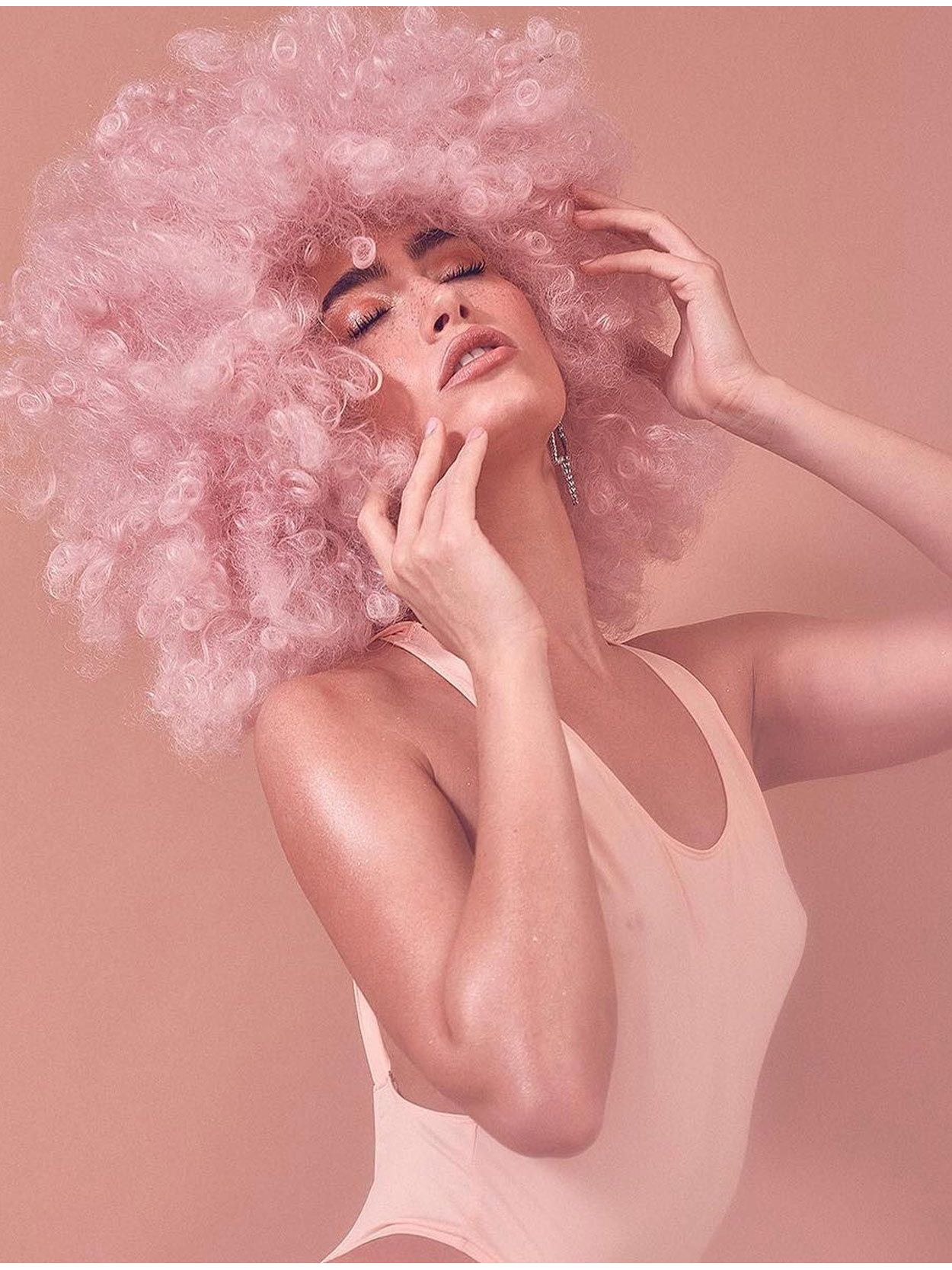 Perfect, pastel pink curly afro hair styled into an extra large design as featured on this year's catwalks.