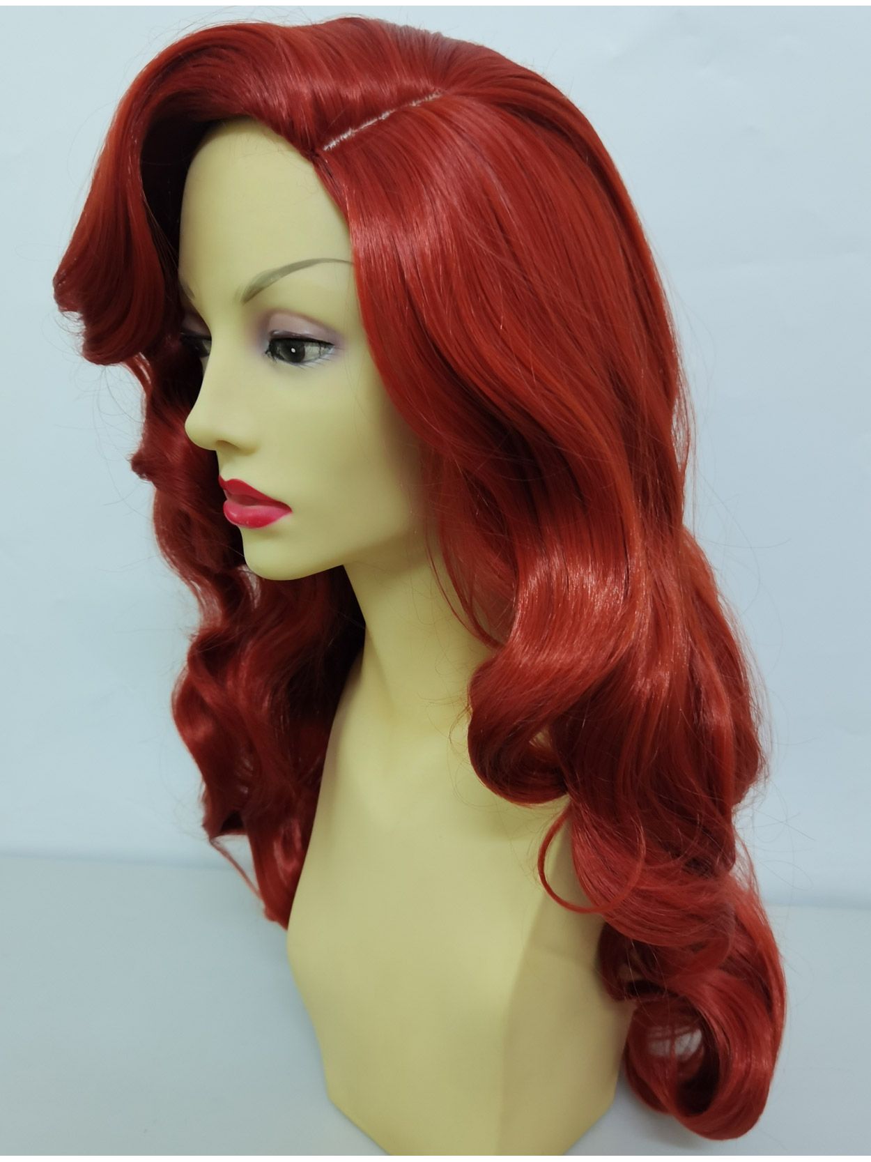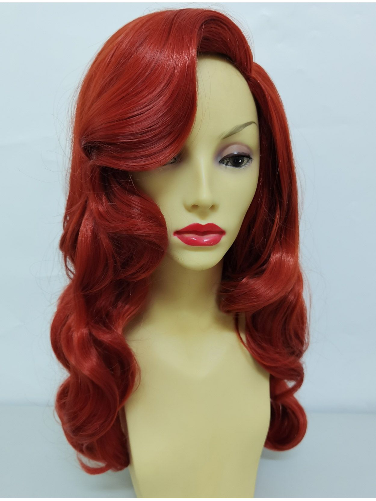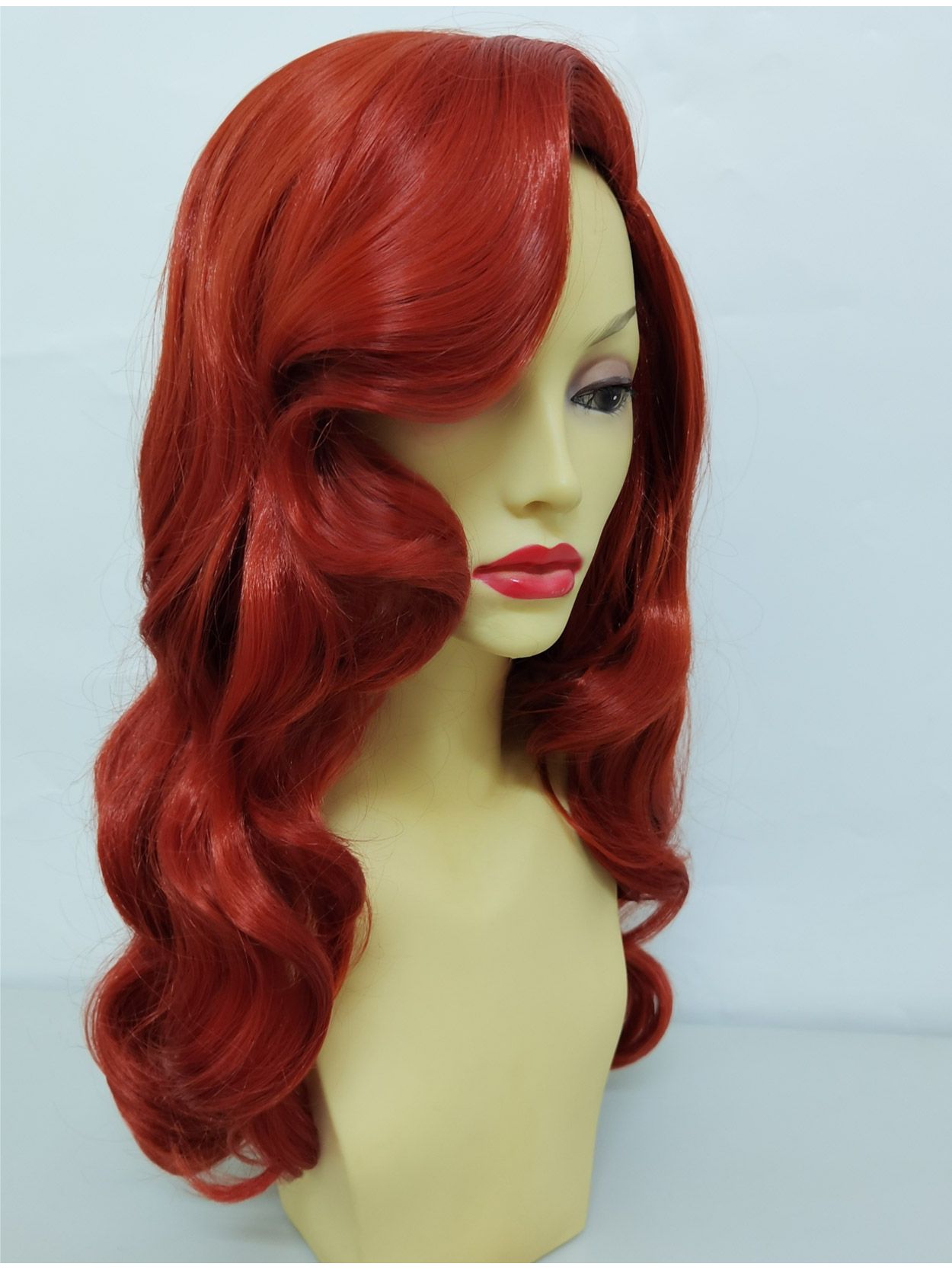 The Jessica Rabbit wig has a long rustic red, layered design with side part and dramatic side swept fringe, perfect for a seductive 'over the eye' look.
