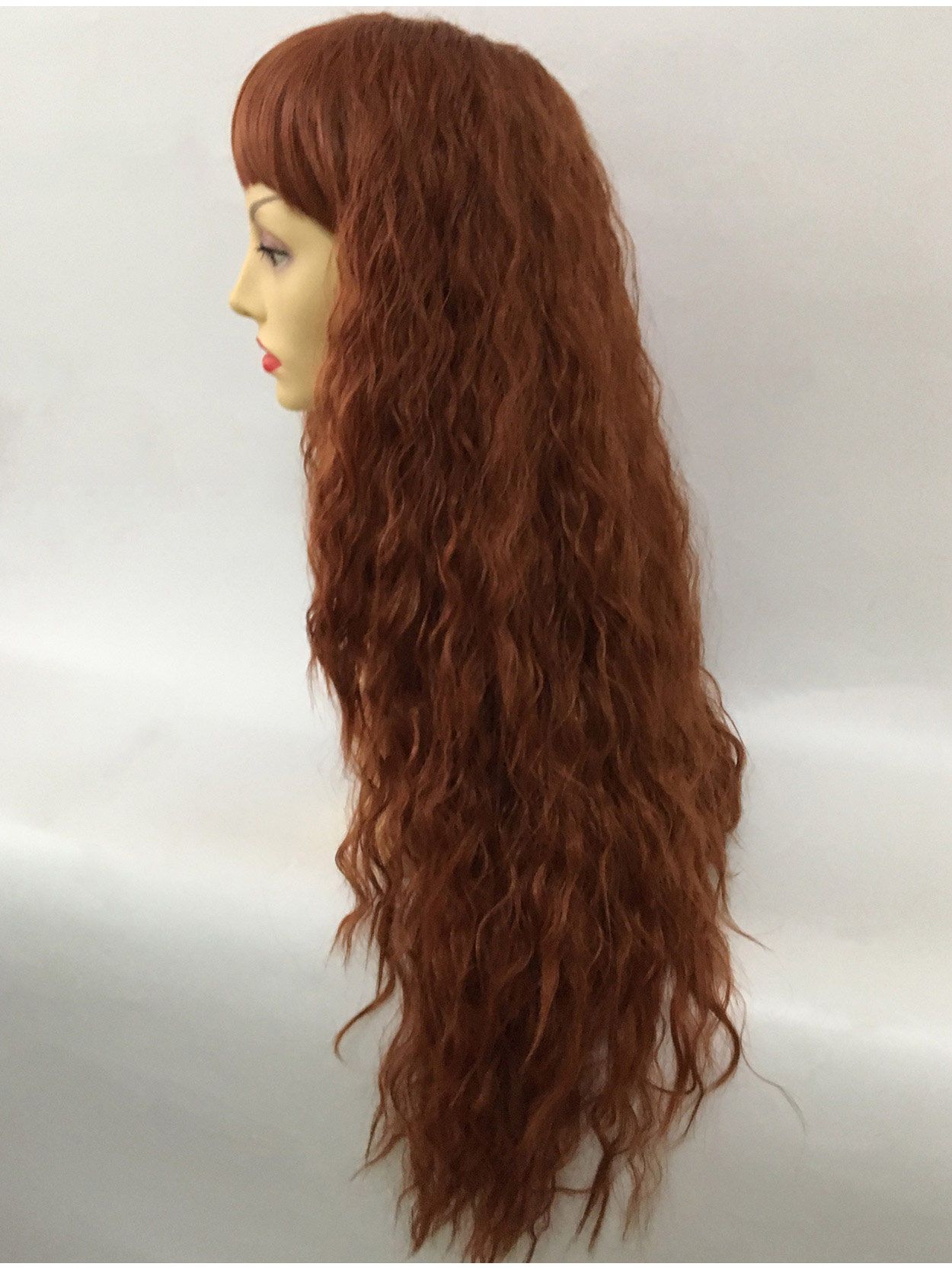 Sublime, thick and full extra long redhead wig with multiple crimped effect, wavy layers and full, straight bangs.