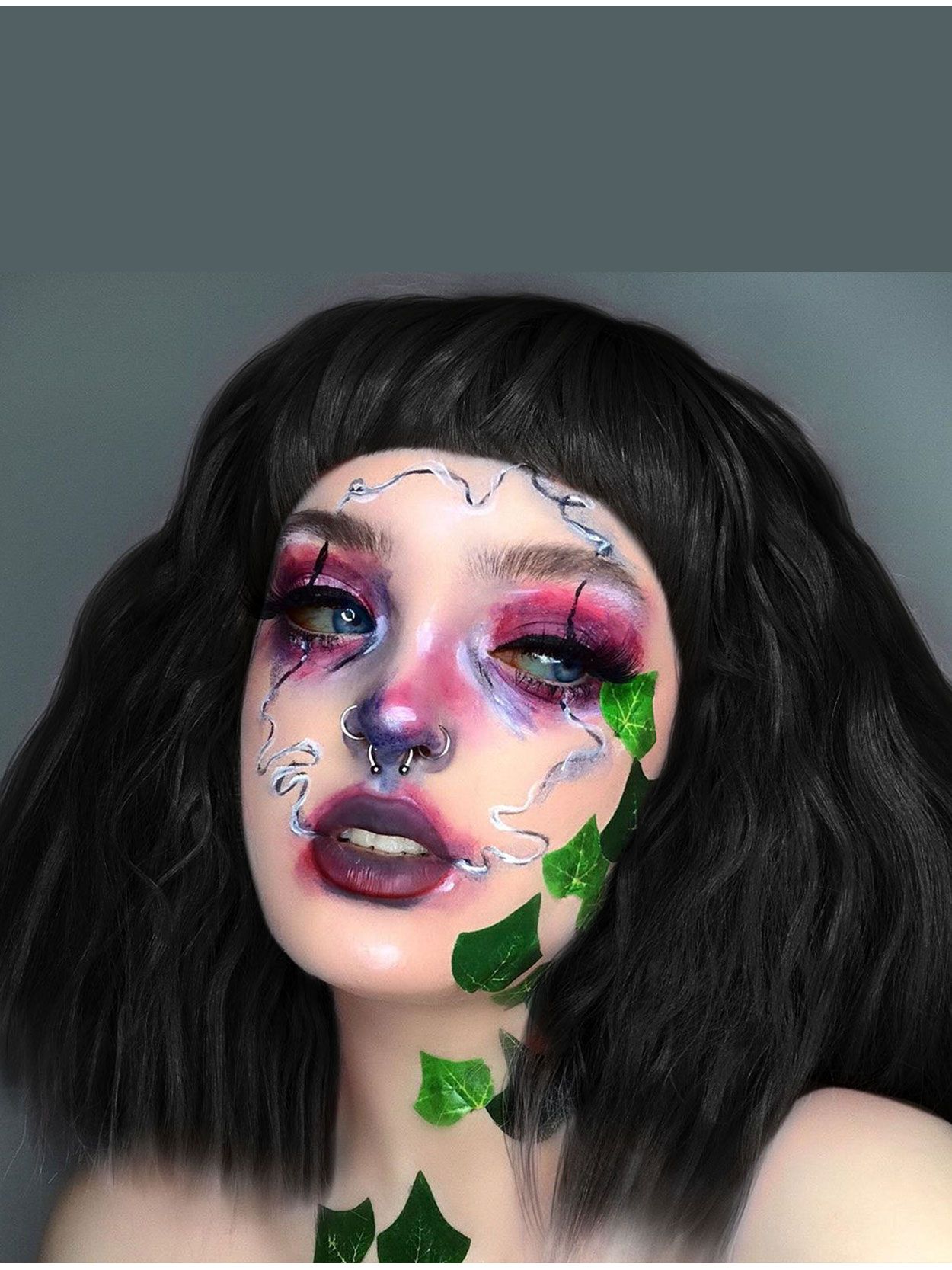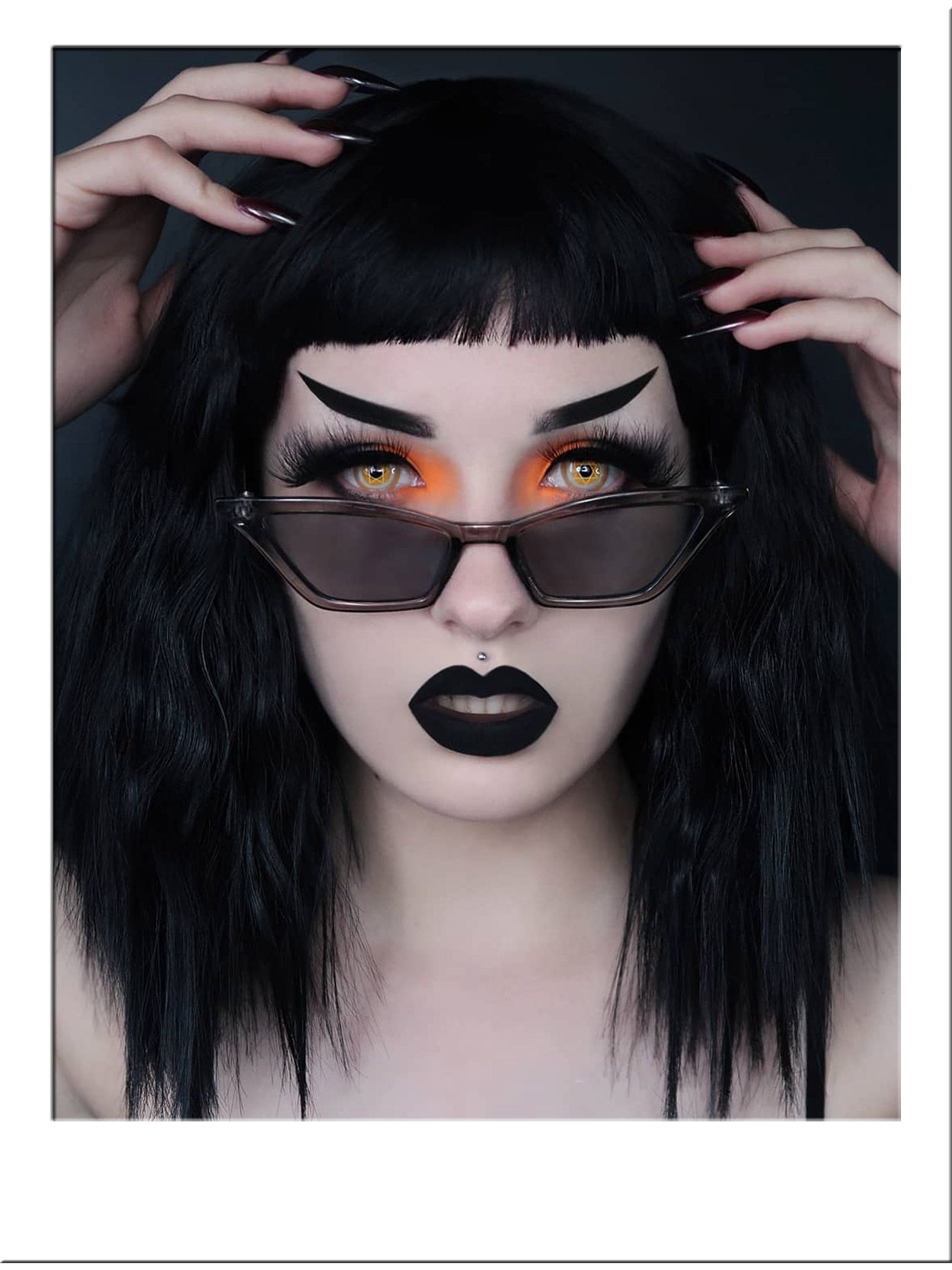 The short bangs with blunt edge create that stark contrast for a contemporary, high fashion finish.