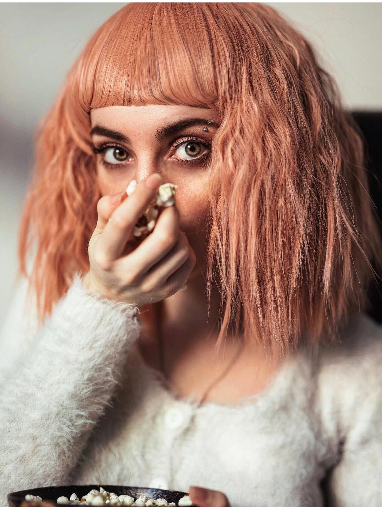 Short, blunt retro bangs add a beautiful, bold contrast.