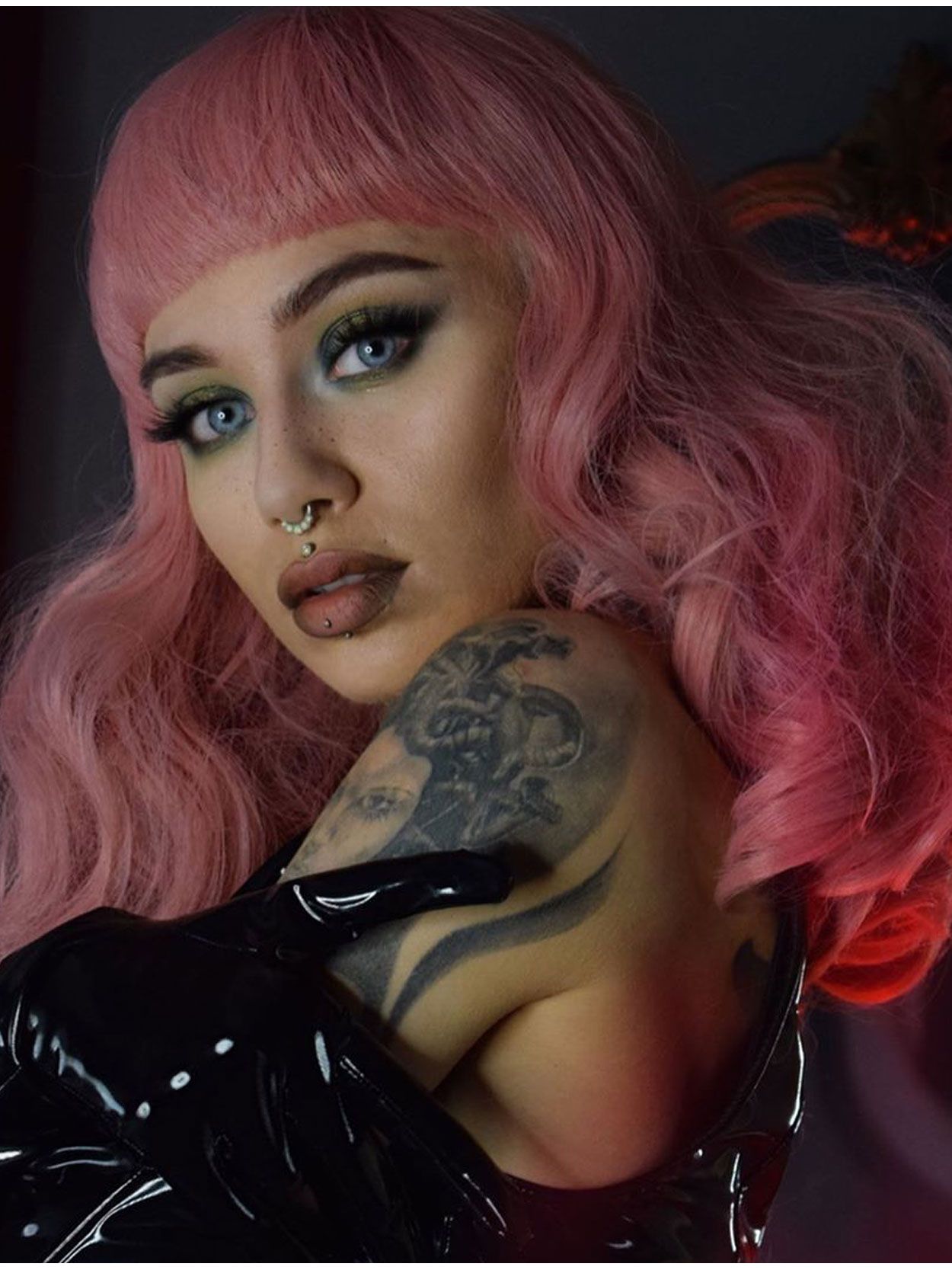 The short, blunt Bettie Page bangs cement the retro glamour and add a bold, edgy look to this delightful piece.