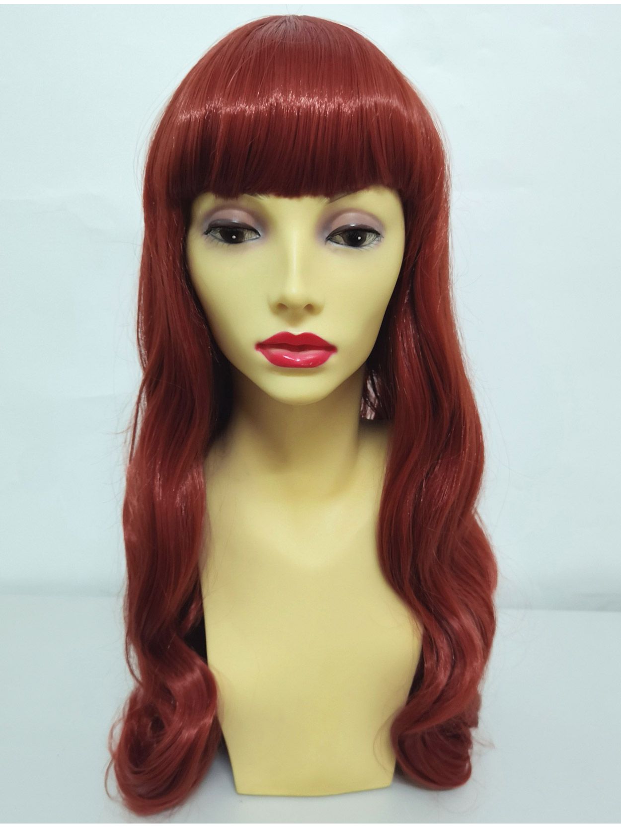 The vintage 50s inspired wig boasts old Hollywood big, glam waves in a seductive shade of burnt orange.