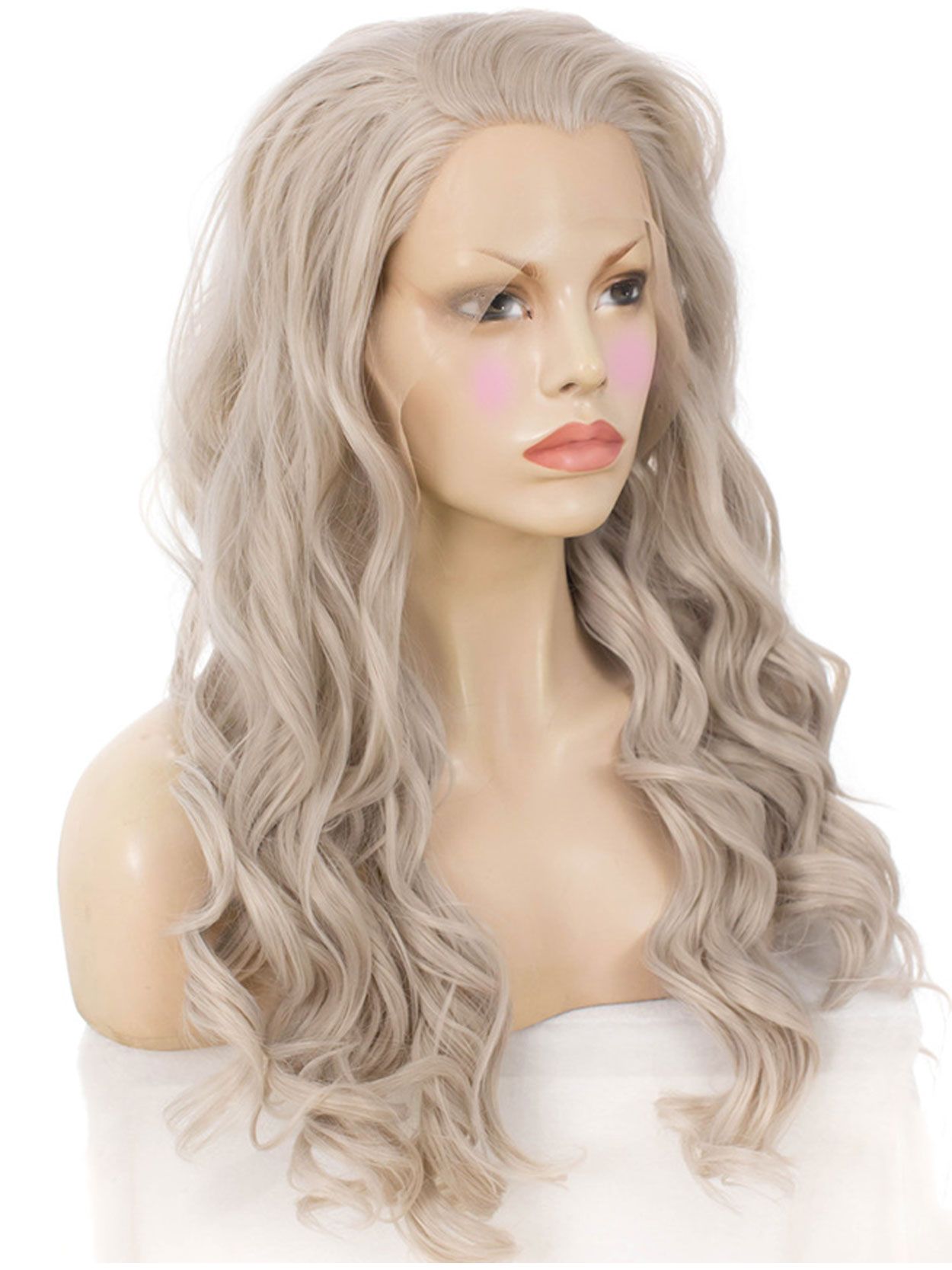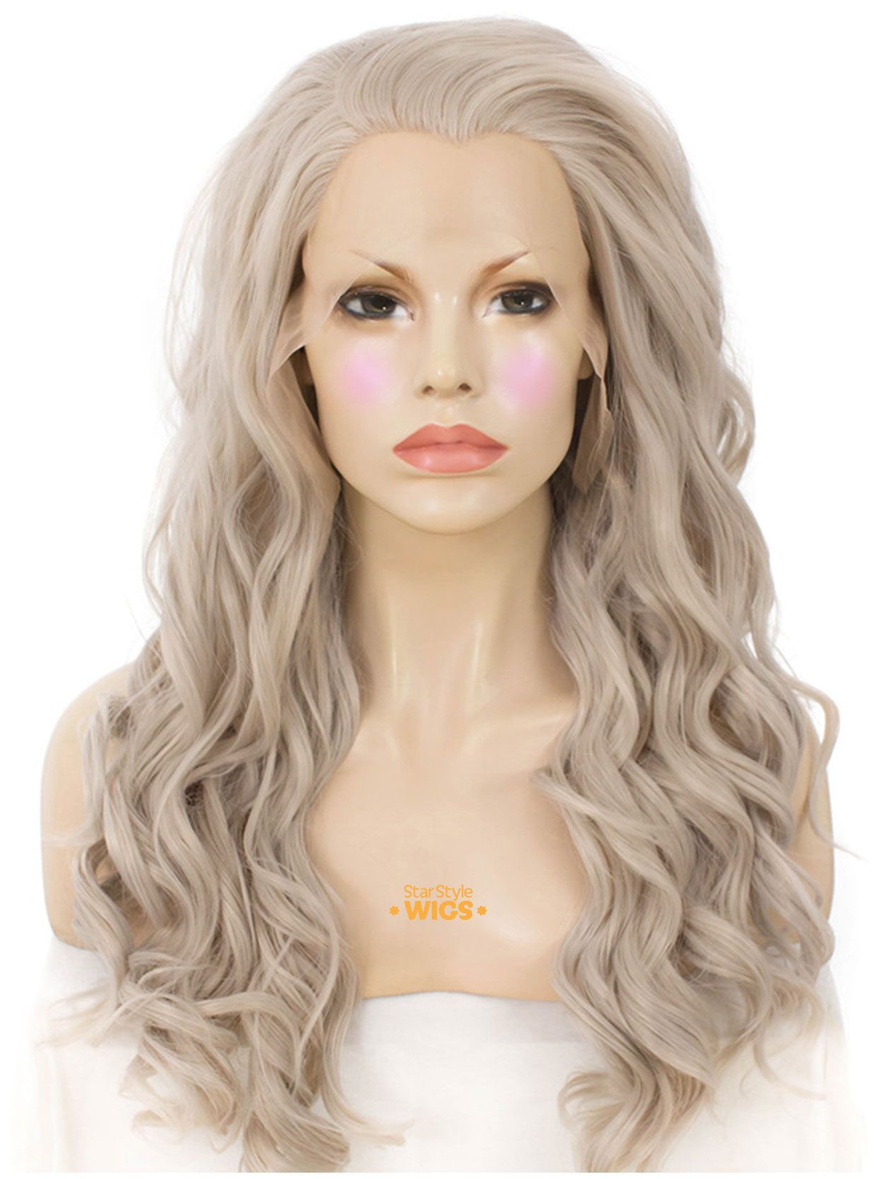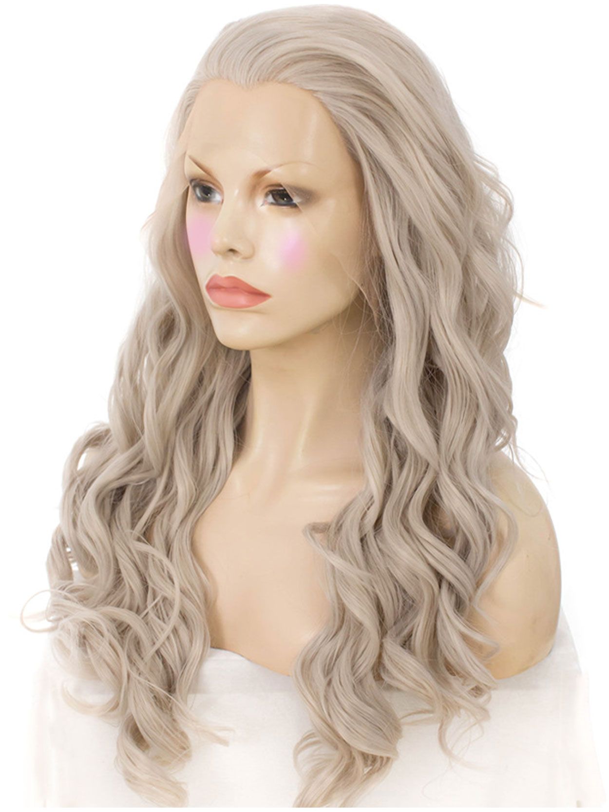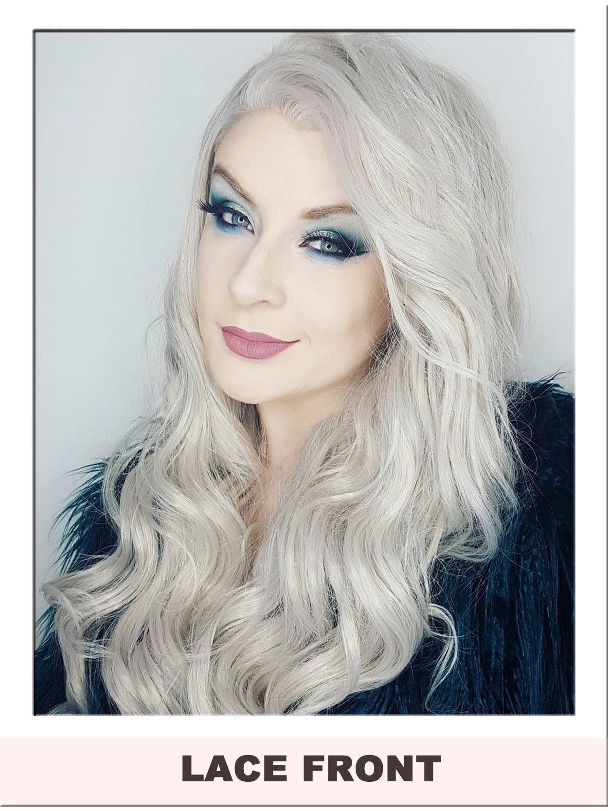 This goddess inspired lace front wig features tumbling, layered curls in the lightest of grey shades with a subtle silver sheen.