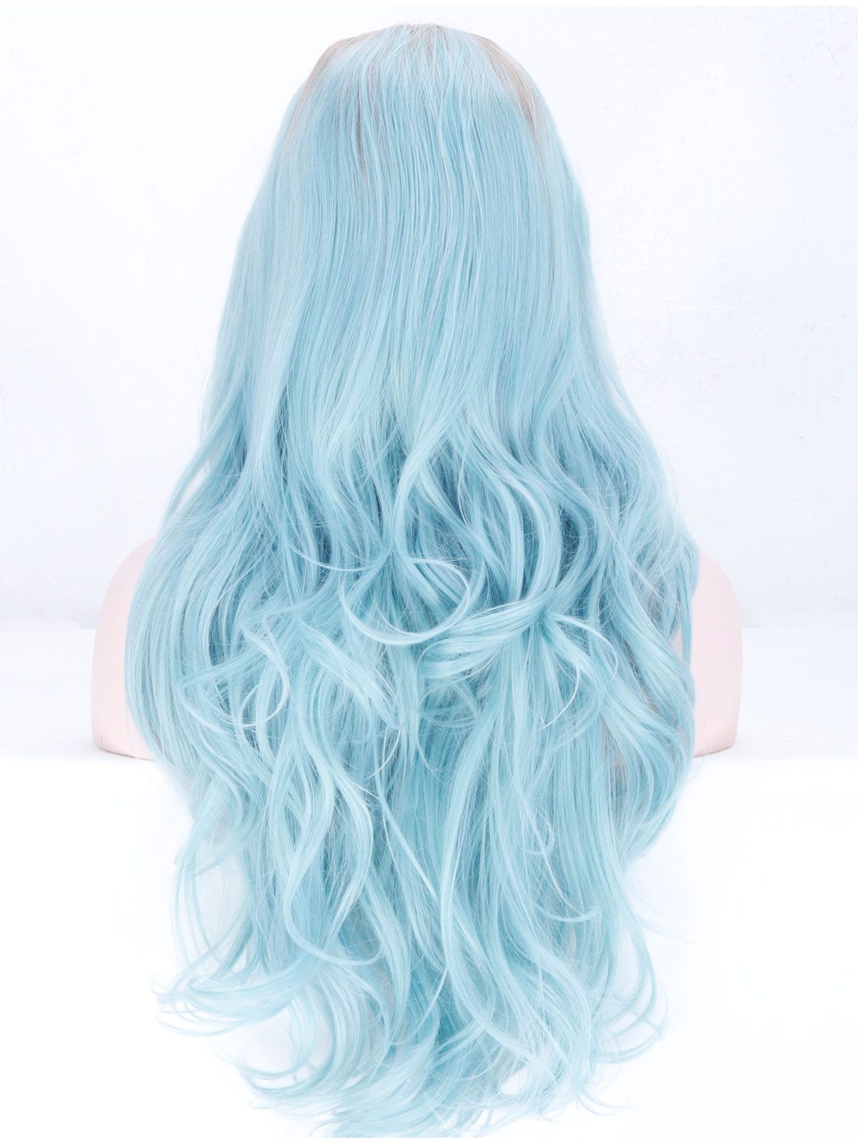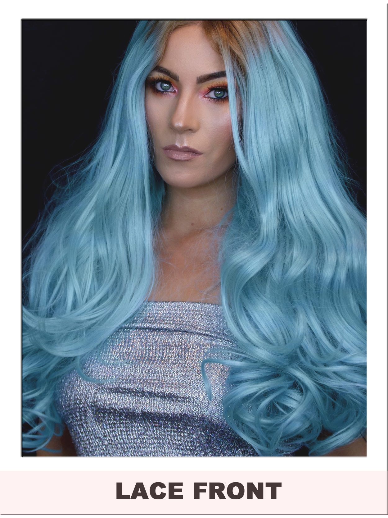 Heavenly long, light blue lace front wig with wavy hair lengths and centre part line.